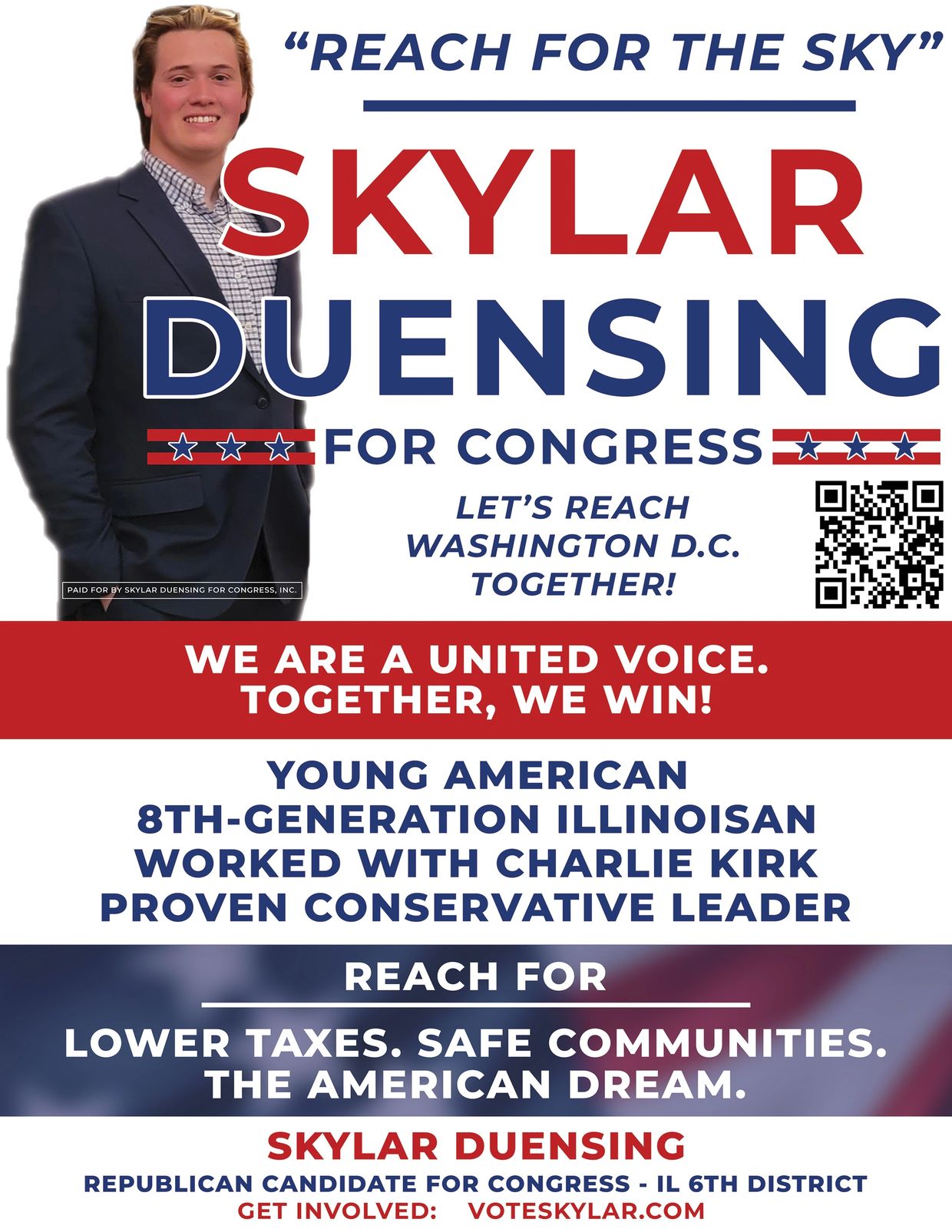 Skylar Duensing is a young American working to build a better and more prosperous future for all. Skylar is an 8th-generation Illinoisan. His family’s blood, sweat, and tears are in this ground. Starting with very little, the Duensing family came to the United States in 1837 for opportunity and newfound freedom. Put simply, they came for the American Dream.